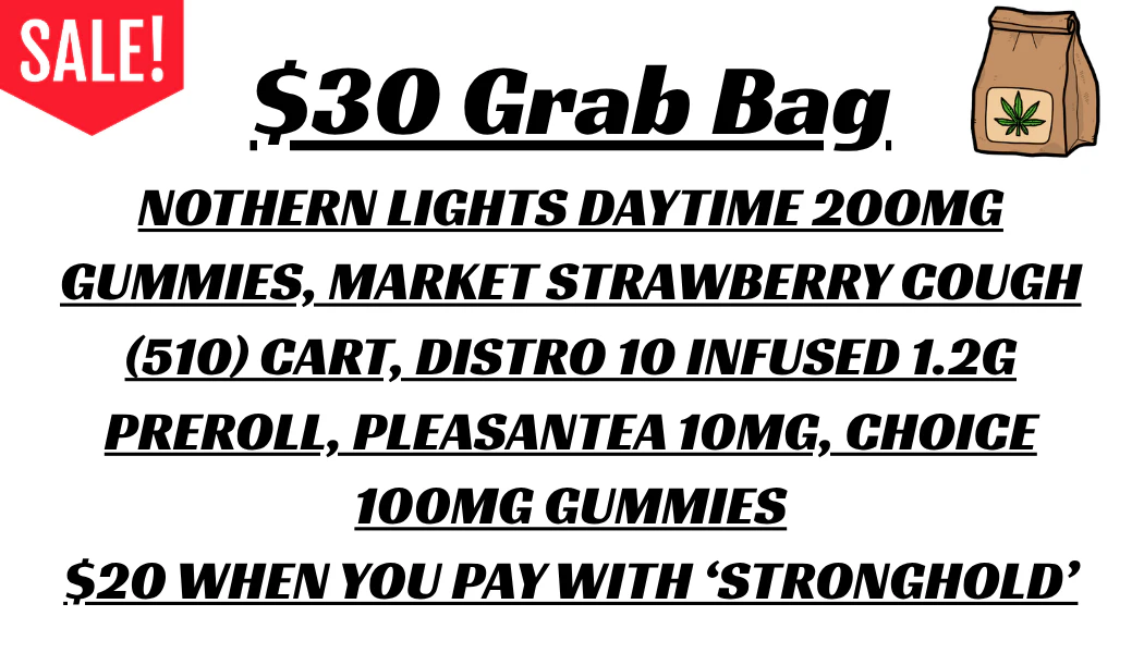 $30 Grab Bag Includes Pleasantea 10mg, Market 510 1g, Distro 10 Infused Preroll 1.2g, Northern Lights FX Daytime Gummies 200mg & a bag of Choice 100mg Gummies. Purchase online and pay using Stronghold to get this grab bag for $20!!!