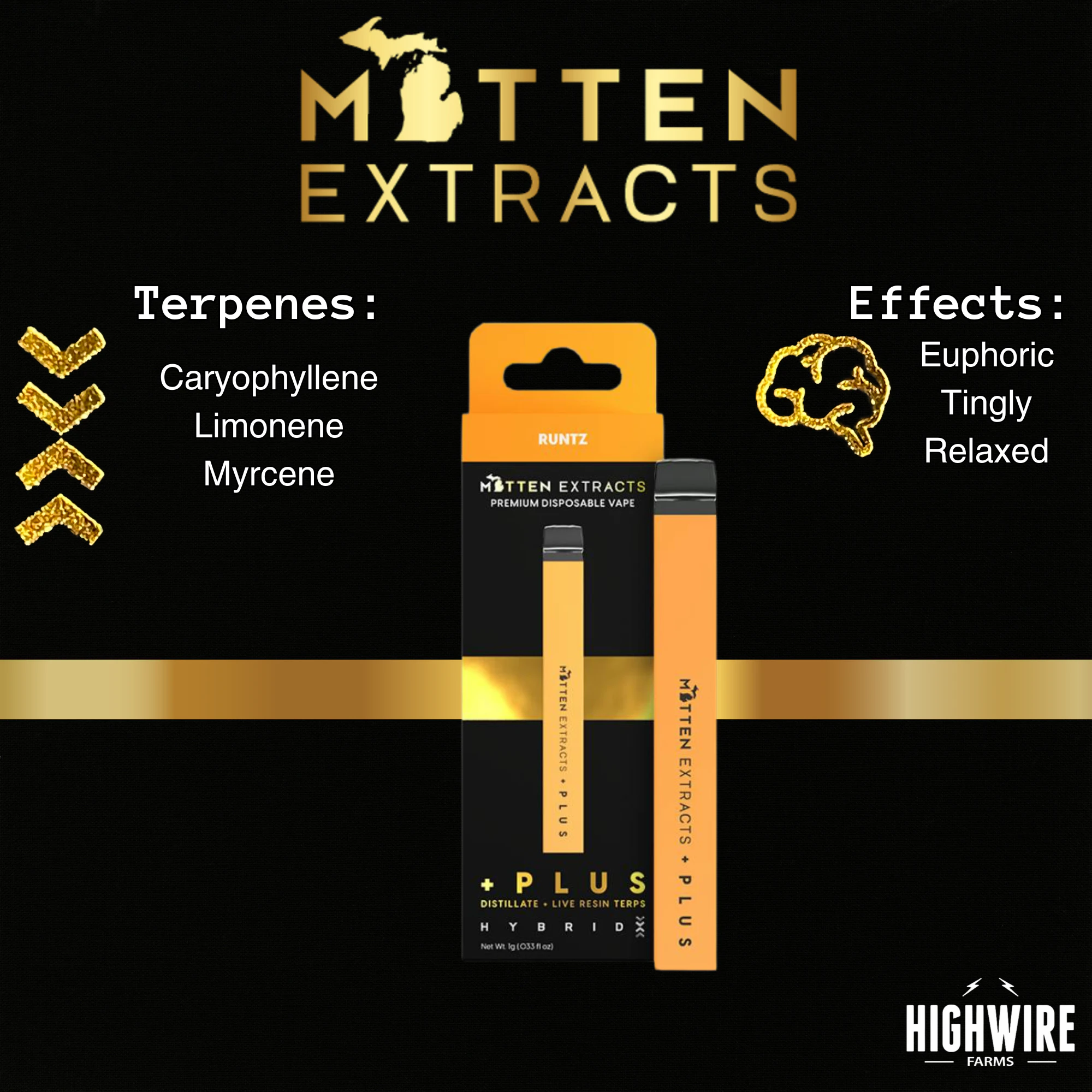 Welcome to the Mitten! These all in one Disposables are rechargeable & perfect for on the go! ✨ Mitten Extracts Plus offers premium distillate oil plus Live Resin terpenes for unmatched potency & flavors! 🧡 Runtz is an Indica Dominate Strain offering Calming, Relaxed & Euphoric effects! Terpenes you'll find in 🧡 Runtz are Beta-Caryophyllene (Peppery), Limonene (Citrus), Myrcene (Herbal)