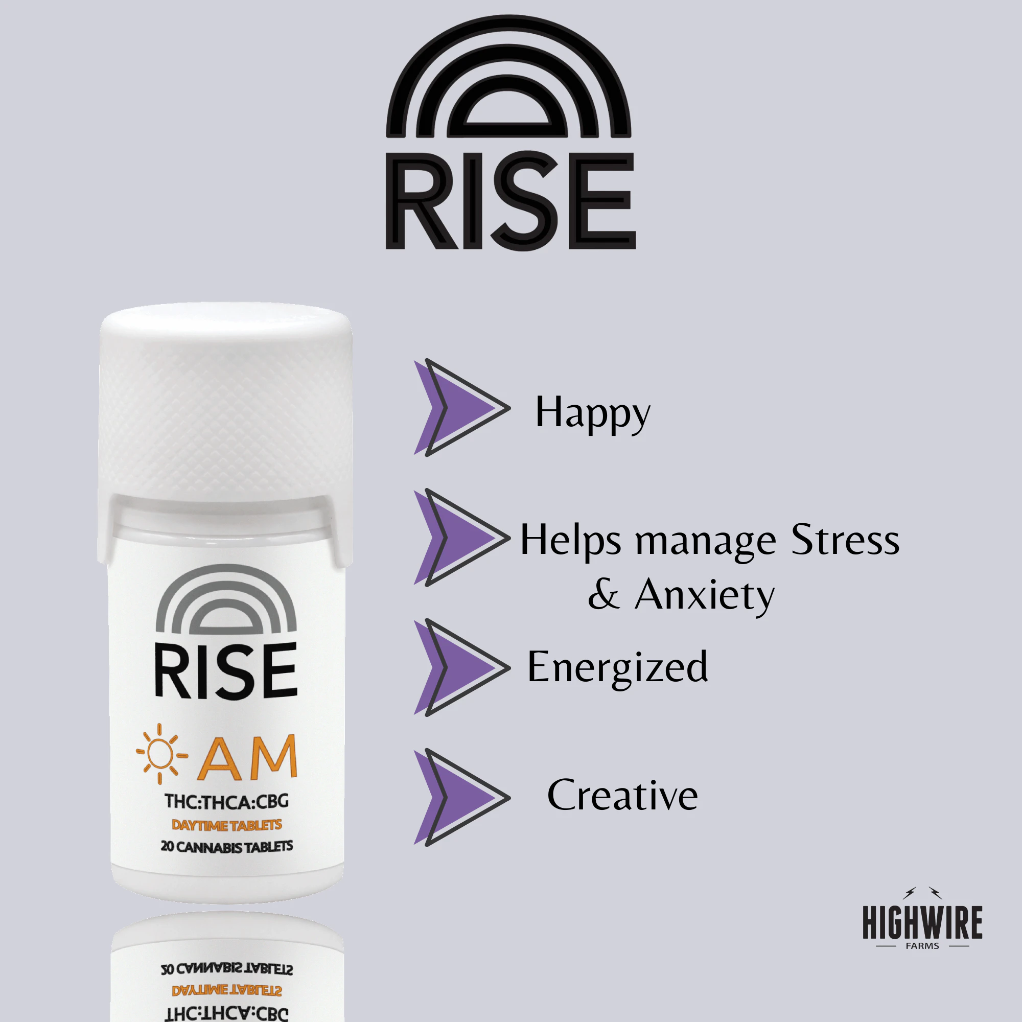 🌅 Rise & Shine with Rise AM Tablets! Rise offers an Energizing Blend of THC:THCa:CBG Tablets; This energizing blend offers extra star cannabinoids such as CBG & THCA! When these cannabinoids work together they may help with symptoms associated with Appetite loss, Nausea, Neuroprotection, Depression & gut heath!